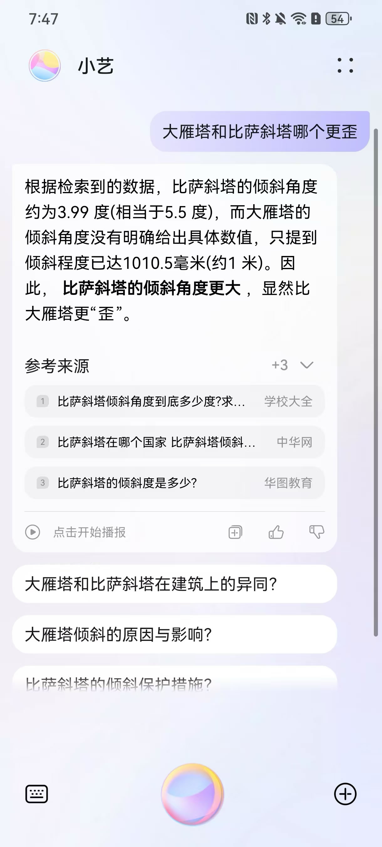 確定好目的地之后,到底怎么玩?對大多數(shù)人來說,既要規(guī)劃詳細、又要細節(jié)不出紕漏的“完美旅行攻略”非常費時費力。而小藝可以從特色景點、住宿、餐飲、注意事項等多個維度出發(fā),結合用戶確定的旅行目的地,為你解答各種旅行知識,堪稱旅行界的百科全書。用戶只需長按華為手機電源鍵或者對手機說“小藝小藝”即可喚醒小藝,不論是詢問當?shù)氐娜宋闹R、歷史典故,還是推薦熱門景點、美食小吃,小藝都能對答如流,幫助大家更快速了解目的地的相關信息。比如你可以直接問它“為什么景德鎮(zhèn)的瓷器很出名”、大雁塔和比薩斜塔哪個更歪” “為什么很多人喝不慣北京豆汁兒”,通過各種問題逐漸了解到目的地的各種信息,幫助提升旅行體驗。