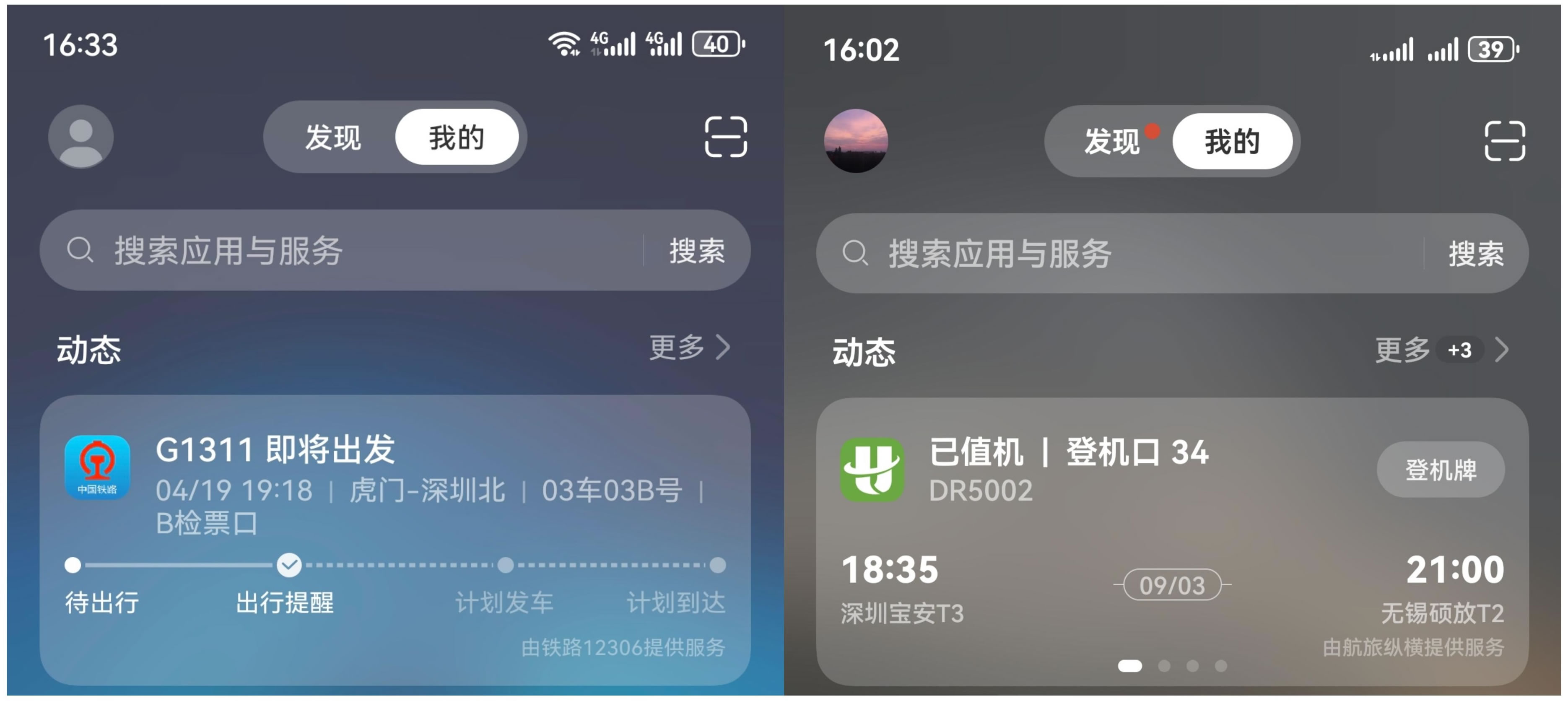 假期出行高峰期,高鐵飛機可能會晚點、延誤,出行信息繁多且易忘。華為負一屏提供的實時動態(tài)卡片就非常實用。在負一屏打開航班、火車服務通知,綁定賬號后,只需手機桌面右滑至負一屏,即可查看12306火車或航旅縱橫航班實時動態(tài),輔助旅途中行程安排準確及時、防止遺忘重要信息。