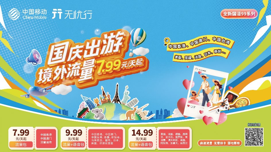 這個國慶,想要來一場說走就走的出境游,記得到中國移動APP【首頁-國漫專區(qū)】頁面或無憂行APP【流量-境外流量】頁面,選購國漫99系列產品, 出境前記得開通【中國移動國際/港澳臺漫游功能】,就可以輕松解決境外通訊問題啦!讓中國移動帶給你高速穩(wěn)定的網(wǎng)絡體驗和服務。