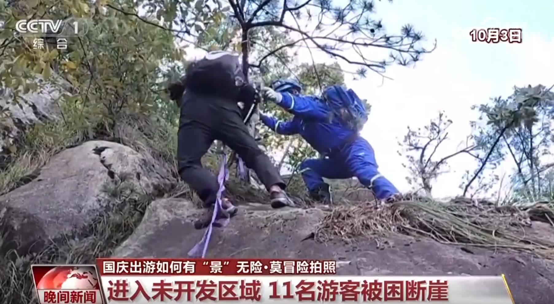 10月2日傍晚,有11名外地游客在安徽績溪縣一座未開發(fā)的山上攀爬時,因為迷路導致被困,當?shù)毓埠兔耖g救援隊立即展開聯(lián)合救援。在3日凌晨一點多,救援人員找到了被困游客,由于游客被困的地方是未開發(fā)的區(qū)域,山勢十分陡峭,且有多處斷崖,救援人員只能反復利用繩索,將被困游客挨個兒送至安全地帶。