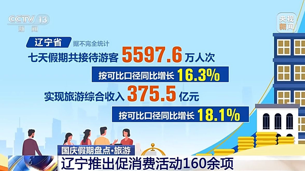 遼寧省據(jù)不完全統(tǒng)計(jì),七天假期共接待游客5597.6萬人次,按可比口徑同比增長16.3%,實(shí)現(xiàn)旅游綜合收入375.5億元,按可比口徑同比增長18.1%。假期里遼寧省推出促消費(fèi)活動(dòng)160余項(xiàng),全省各地舉辦文化藝術(shù)、群眾文化、非遺、文博等各類活動(dòng)600余場(chǎng),通過線上線下聯(lián)動(dòng)的方式,豐富人們假日文化生活。