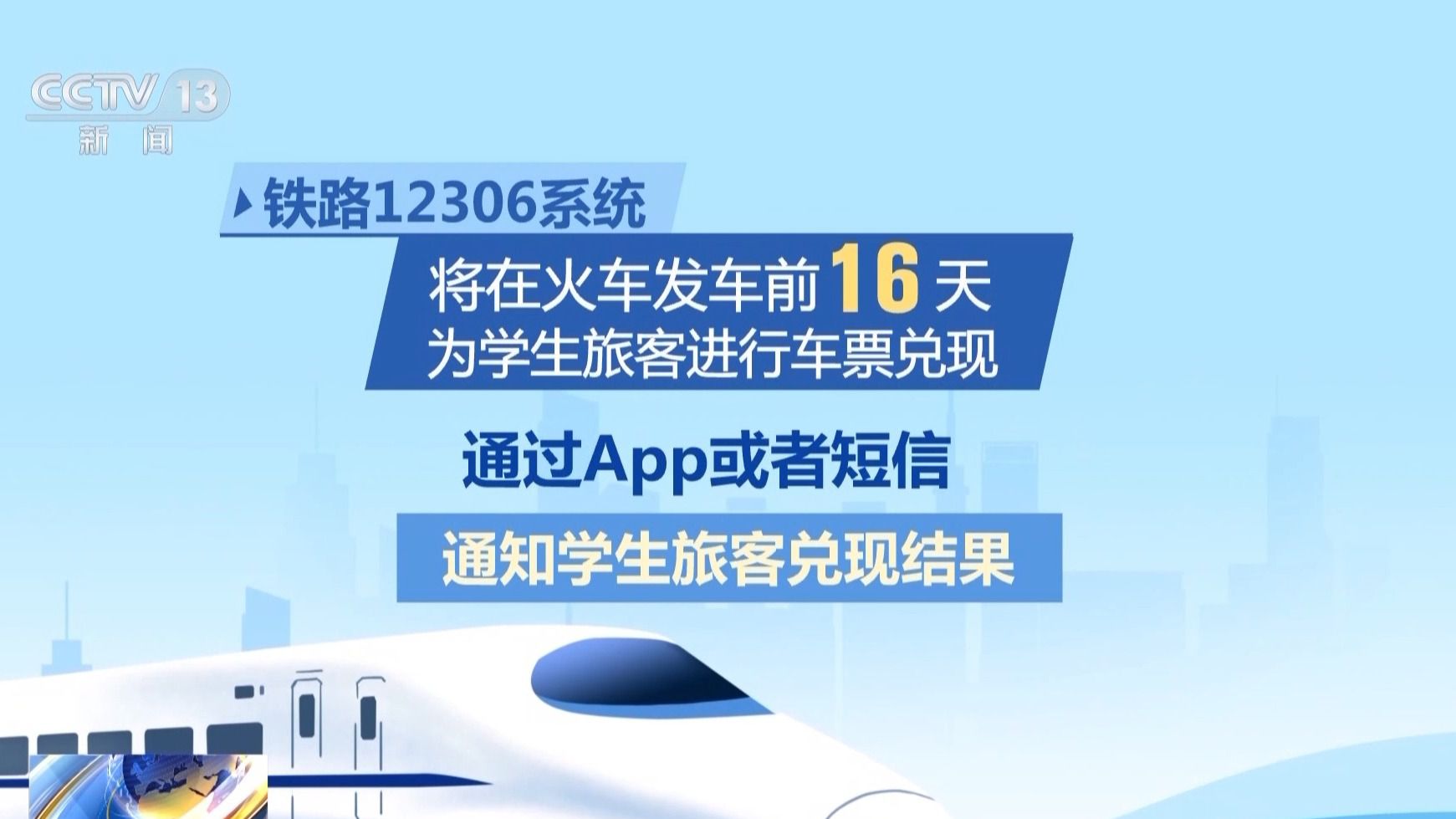 鐵路12306系統(tǒng)將在火車發(fā)車前16天為學生旅客進行車票兌現(xiàn),并通過App通知或者短信通知學生旅客兌現(xiàn)結(jié)果。車票兌現(xiàn)成功后,學生旅客需在當日23時前,在鐵路12306App中完成預約購票訂單支付。