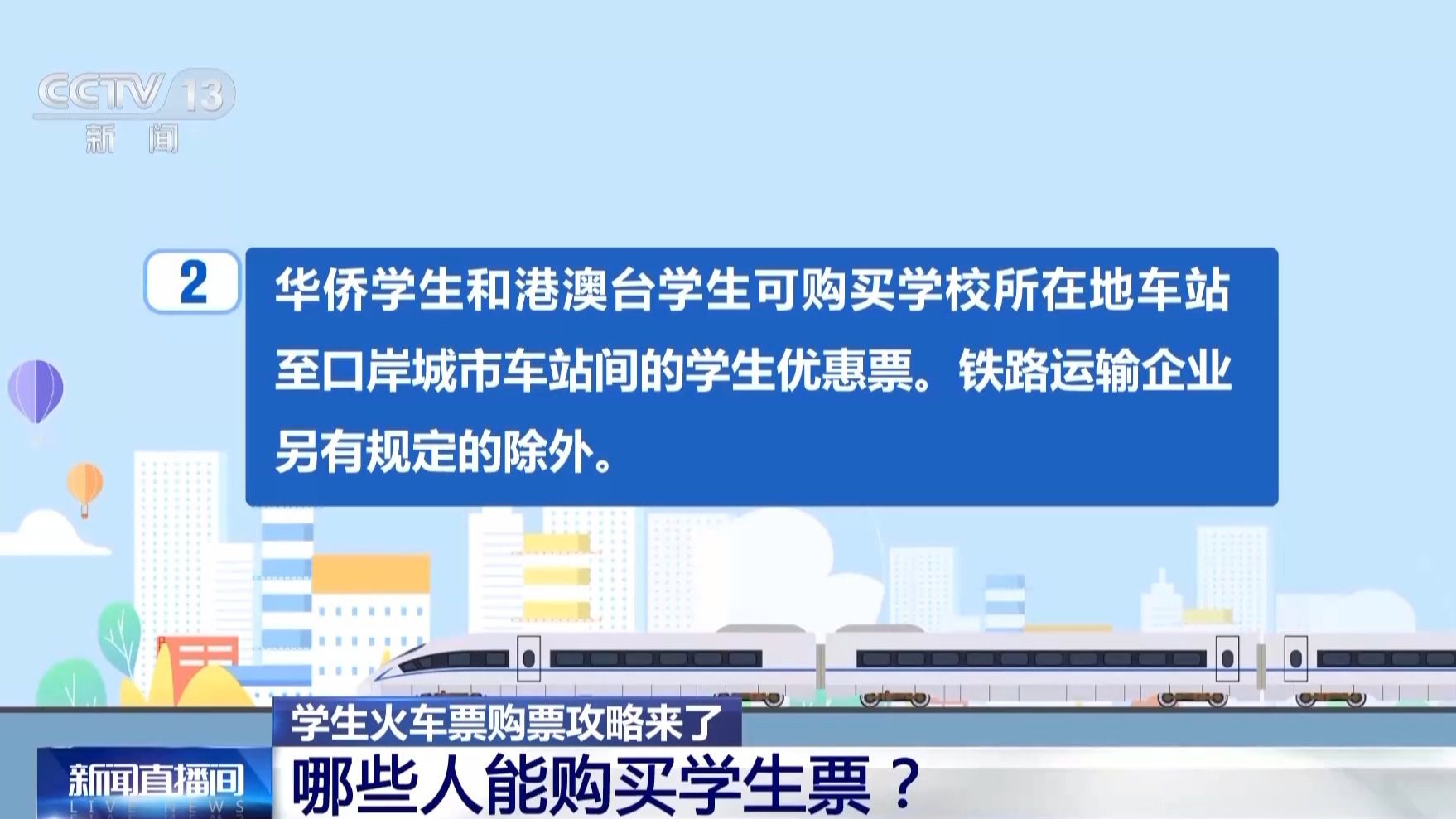 華僑學生和港澳臺學生可購買學校所在地車站至口岸城市車站間的學生優(yōu)惠票。鐵路運輸企業(yè)另有規(guī)定的除外。