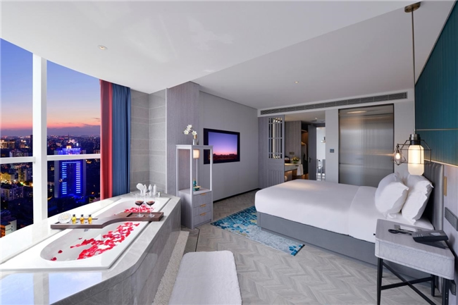 客房哲學(xué):320間客房搭配全景落地窗設(shè)計,干濕分離設(shè)計搭配臨窗浴缸,申寶冷暖床墊實(shí)現(xiàn)“冬暖夏涼”智能溫控,高端雅蘭布草,細(xì)節(jié)處彰顯東方待客之道。