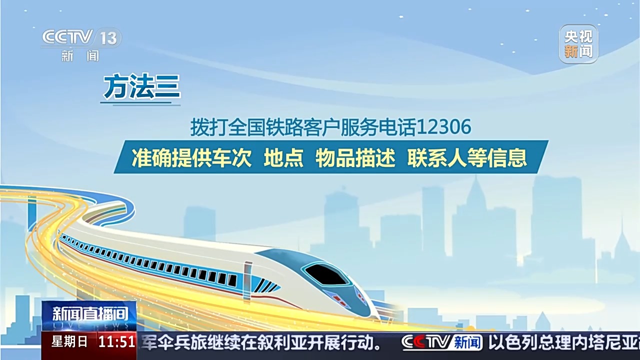 方法三:撥打全國(guó)鐵路客戶服務(wù)電話12306,準(zhǔn)確提供車次、地點(diǎn)、物品描述、聯(lián)系人等信息,鐵路部門將全力幫您查找。