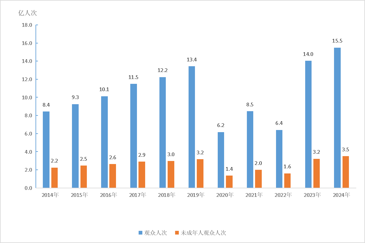 圖4:2014—2024年全國文物機構接待觀眾人次及未成年人觀眾人次