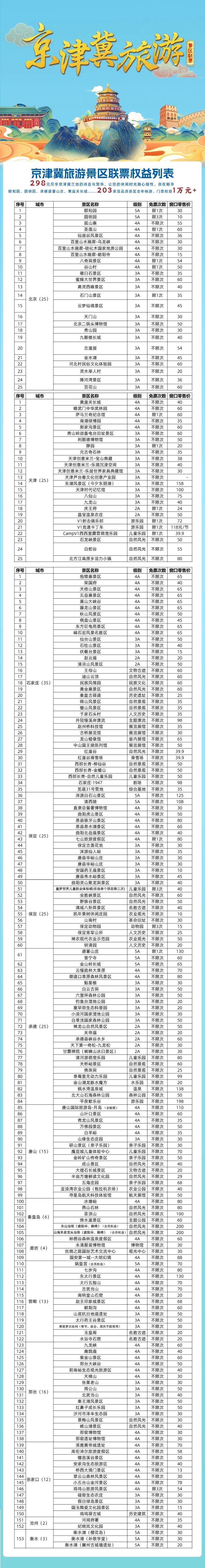 首批入選聯(lián)票的景區(qū)中,北京、天津各25家,河北153家。其中,石家莊景區(qū)涵蓋正定古城、隆興寺、趙州橋等文化地標,以及西部長青、漫山花溪谷等自然休閑勝地,為游客提供多樣化選擇。游客線上可通過“文創(chuàng)行”“全冀游”“樂游京津冀一碼通”等平臺購買。