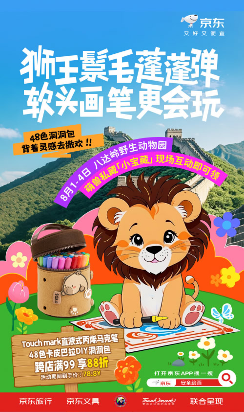如今暑假期間帶孩子打卡動(dòng)物園和大自然互動(dòng)成為了出游的首選,作為中國(guó)最大的山地野生動(dòng)物園,北京八達(dá)嶺野生動(dòng)物園匯集了世界各地的眾多代表性動(dòng)物,非常適合激發(fā)孩子的創(chuàng)作靈感,在運(yùn)用中掌握繪畫技能。在8月2日至3日,京東攜手八達(dá)嶺野生動(dòng)物園帶來(lái)“猛獸開(kāi)路 人類穩(wěn)住”文具快閃活動(dòng),活動(dòng)期間京東將安排特色籠車在園區(qū)游覽,為親子游客帶來(lái)有趣有料的繪畫體驗(yàn),游客完成互動(dòng)集章還能領(lǐng)取精美禮包。現(xiàn)場(chǎng),京東文具攜手青竹畫材、Touchmark、輝柏嘉等知名品牌設(shè)置了產(chǎn)品展示區(qū),游客可上手品鑒京東甄選的安全無(wú)毒繪畫文具,掃碼下單還能享受豐厚優(yōu)惠,福利多多。想要和孩子體驗(yàn)一場(chǎng)別開(kāi)生面的繪畫創(chuàng)作,那就記得鎖定京東的這次快閃活動(dòng)。同時(shí),京東還打造“寶藏文具周”線上會(huì)場(chǎng),為消費(fèi)者帶來(lái)寶藏文具推薦,搜索“安全繪畫”一鍵直達(dá)暑假寶藏文具周·靈感周會(huì)場(chǎng),安全無(wú)毒隨意畫,親膚水洗真放心。