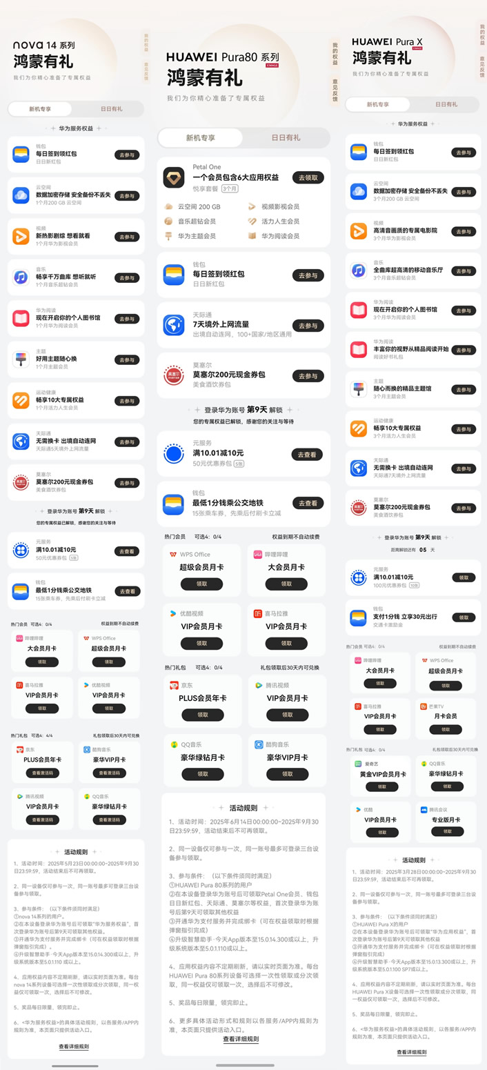 暑期,華為“負(fù)一屏”還上線了“鴻蒙有禮”權(quán)益禮包,覆蓋影視娛樂(lè)、旅行交通、外賣(mài)餐飲等多重場(chǎng)景,為用戶帶來(lái)更便捷、更優(yōu)惠、更智慧的暑期生活服務(wù)。購(gòu)買(mǎi)Pura X、nova 14系列及Pura 80的新用戶還有額外的“新機(jī)專享”禮包。喚醒小藝說(shuō):“幫我領(lǐng)鴻蒙有禮”也能跳轉(zhuǎn)領(lǐng)取。