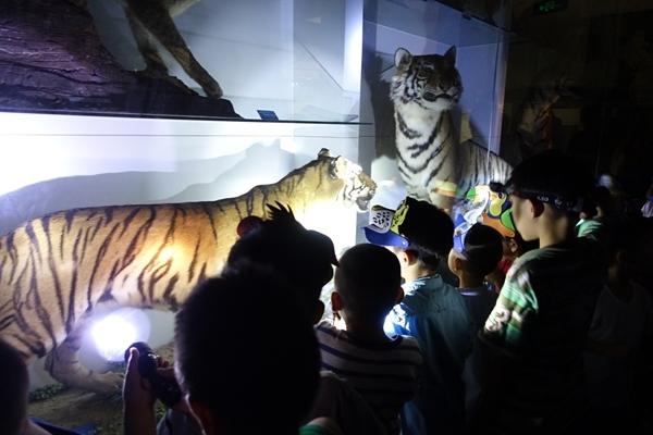 孩子們在國家動(dòng)物博物館熄燈環(huán)境里用手電筒照明,觀察孟加拉虎和東北虎標(biāo)本。受訪者供圖