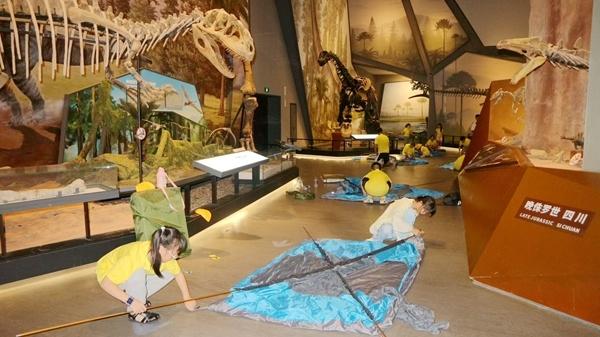 為應(yīng)對(duì)夜場活動(dòng)數(shù)量多、而館內(nèi)工作人員有限的情況,博物館引入專業(yè)研學(xué)團(tuán)隊(duì)負(fù)責(zé)夜宿活動(dòng)的策劃與執(zhí)行。30組親子家庭在破冰活動(dòng)后,跟隨專業(yè)講解員走進(jìn)展廳,深入了解脊椎動(dòng)物的演化歷程;體驗(yàn)4D電影和化石盲盒等手工制作;最后,在博物館鎮(zhèn)館之寶——長達(dá)26米的馬門溪龍骨架化石下搭起帳篷,伴著生動(dòng)的睡前故事進(jìn)入夢鄉(xiāng)。