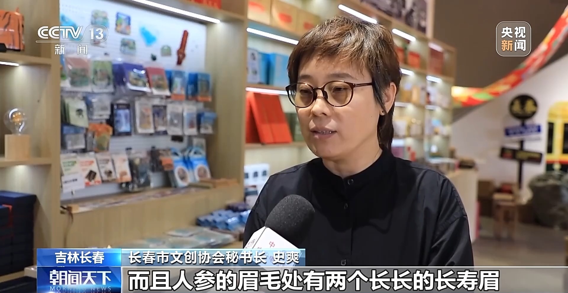 長春市文創(chuàng)協(xié)會秘書長 史爽:因為我們吉林省是人參的主要產(chǎn)地,上面的紅圍脖結(jié)合了我們原有的人參典故,系紅繩的這樣的一個典故,而且人參的這眉毛處有兩條長長的長壽眉,象征著吉祥如意。