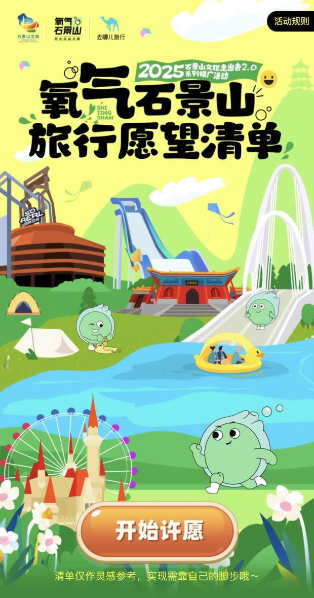 在“去哪兒”旅行APP上線“氧氣石景山”文旅專題頁,不僅整合酒店榜單、景區(qū)門票、優(yōu)質攻略等核心文旅資源,更特別設置石景山區(qū)對口支援和協(xié)作地文旅產品版塊,實現(xiàn)“石景山推廣+支援地區(qū)助銷”雙重價值。同步推出的“旅行打卡愿望清單”H5,線上用戶可點亮自己的石景山旅游心愿,生成專屬旅行愿望清單;在高校路演活動中,大學生可分享H5到社交媒體作為參與活動的入場券——既為高校活動預熱,更成為高校路演入場憑證,串聯(lián)起“線上互動-線下參與”的閉環(huán)。