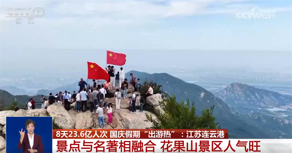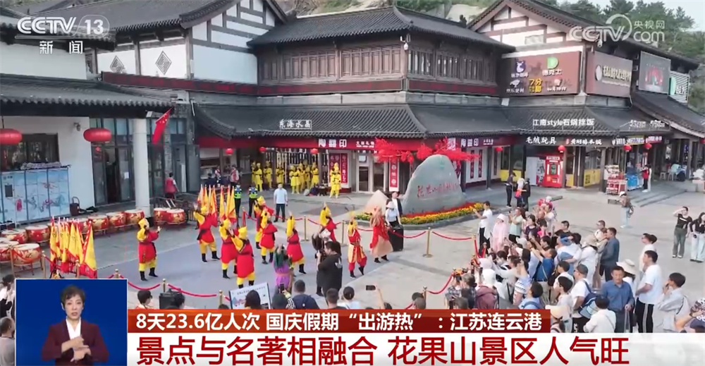 沿著蜿蜒山路,游客們拾級而上,走進(jìn)“水簾洞”登上“玉女峰”,感受藍(lán)天如洗、白云舒展的豪邁。不少游客還在山頂揮舞國旗,慶祝共和國生日。花果山景區(qū)將景點(diǎn)與名著深度融合,為游客準(zhǔn)備了取材自《西游記》精彩片段的情景演出,分布在游客上山的途中,精彩節(jié)目輪番登場,為游客營造出熱鬧喜慶氛圍。