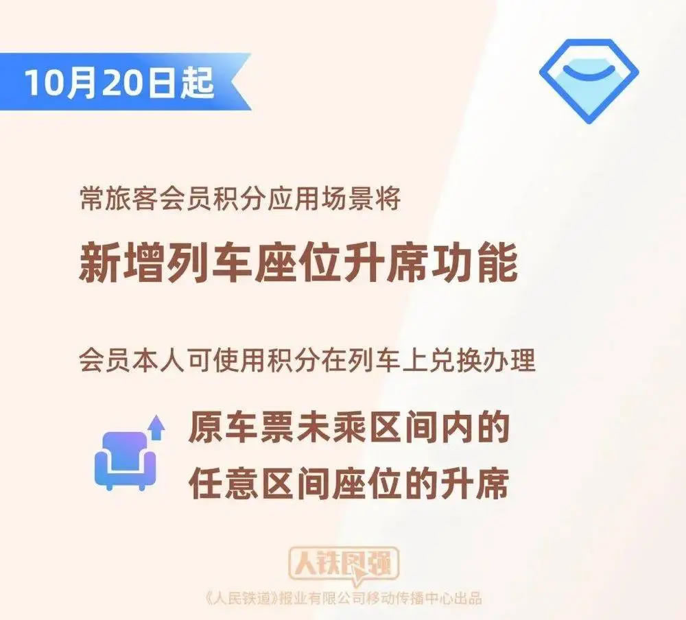 10月20日起,常旅客會員積分應(yīng)用場景將新增列車座位升席功能,會員本人可使用積分在列車上兌換辦理原車票未乘區(qū)間內(nèi)的任意區(qū)間座位的升席。乘車途中,會員可掃描座椅扶手上的“鐵路暢行”二維碼登記升席需求,也可直接聯(lián)系列車工作人員辦理;接到旅客升席需求后,列車工作人員將根據(jù)列車座席空余情況及時進行辦理。