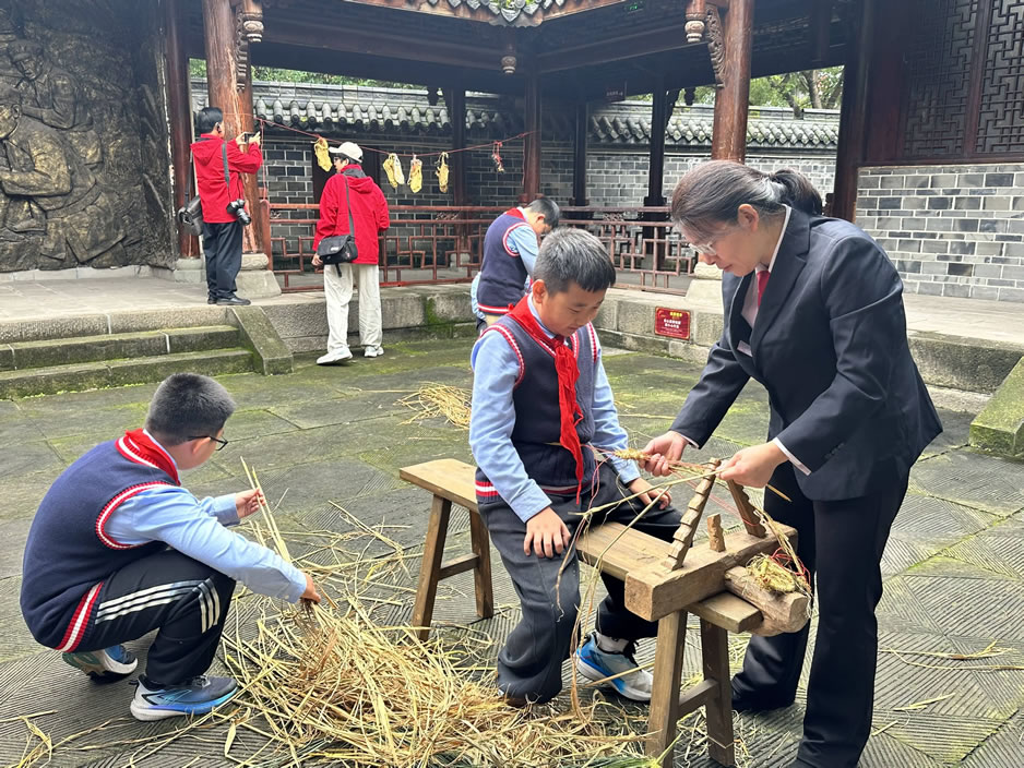 劉瑞龍紅軍小學的學生正在體驗編織紅軍草鞋的過程。新華社記者趙一帆 攝