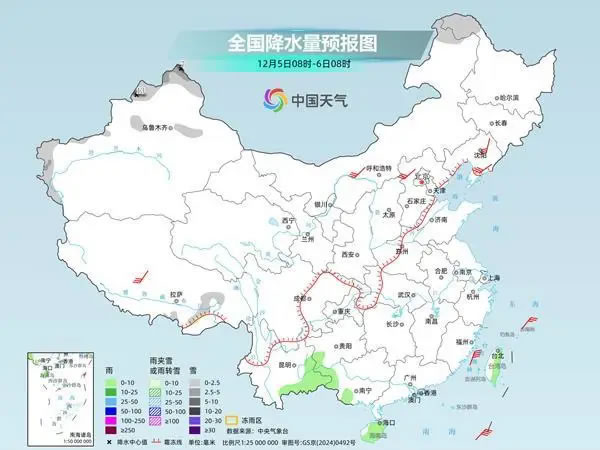 明天,內(nèi)蒙古東北部、黑龍江西北部、新疆北疆北部和南疆西部山區(qū)、西藏東南部等地部分地區(qū)有小到中雪或雨夾雪。其中,新疆北疆北部局地有大雪或暴雪;貴州西南部、云南東部、廣西西部、海南島大部、臺(tái)灣島東部等地部分地區(qū)有小雨。