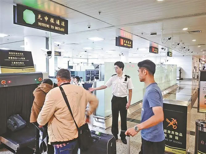 廈門機(jī)場海關(guān)關(guān)員對進(jìn)境旅客開展監(jiān)管作業(yè)。(通訊員 于挺洋 攝)