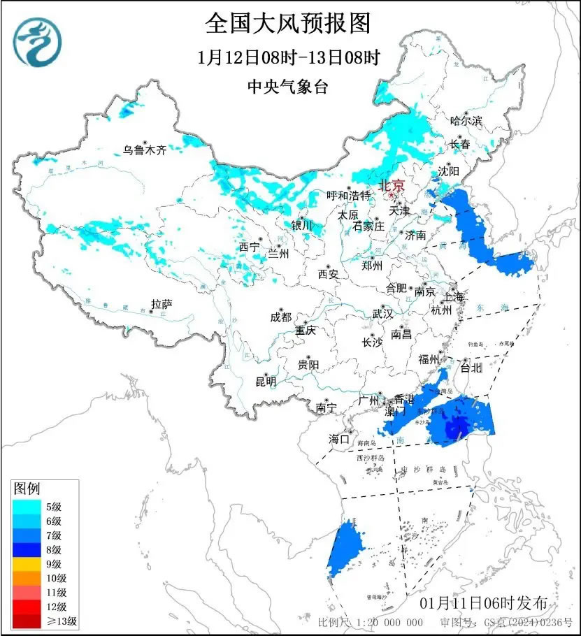 1月12日08時至13日08時,內蒙古中西部、甘肅西部、寧夏北部、華北北部、山東半島、遼東半島等地部分地區(qū)有5~6級大風、陣風7~9級;渤海、渤海海峽、黃海大部海域、東海北部海域、臺灣海峽、巴士海峽、南海北部和西南部海域將有7~8級、陣風9級的風。