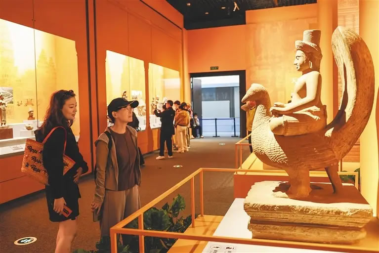 1月22日,觀(guān)眾在中國(guó)(海南)南海博物館里參觀(guān)“水與石的史詩(shī)——柬埔寨古代文明特展”。近日,由中國(guó)(海南)南海博物館、中國(guó)文物交流中心和柬埔寨國(guó)家博物館主辦的“水與石的史詩(shī)——柬埔寨古代文明特展”在中國(guó)(海南)南海博物館開(kāi)幕。該展展出來(lái)自柬埔寨國(guó)家博物館的石雕、陶器等122件(套)精美文物。(記者 張麗蕓)