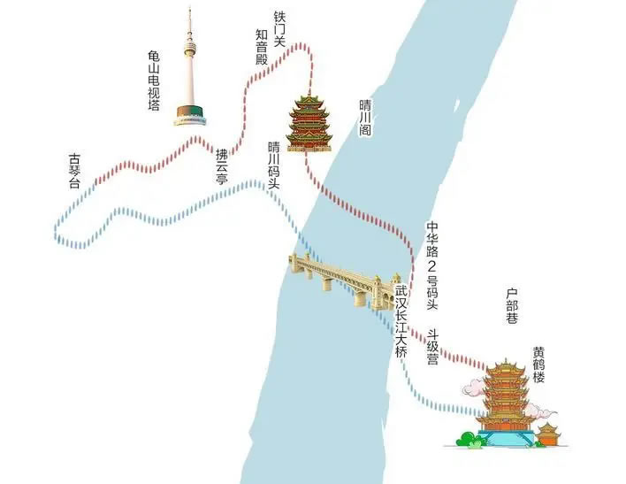 游線從蛇山黃鶴樓出發(fā),經(jīng)斗級營歷史街區(qū)、戶部巷美食區(qū),再乘坐輪渡橫渡長江,途中可觀賞長江大橋及兩岸風(fēng)光,抵達(dá)漢陽后游覽晴川燈會,最終探訪龜山知音殿與古琴臺。線路雖短,卻集中展現(xiàn)武漢“半城山水半城詩”的城市意象。