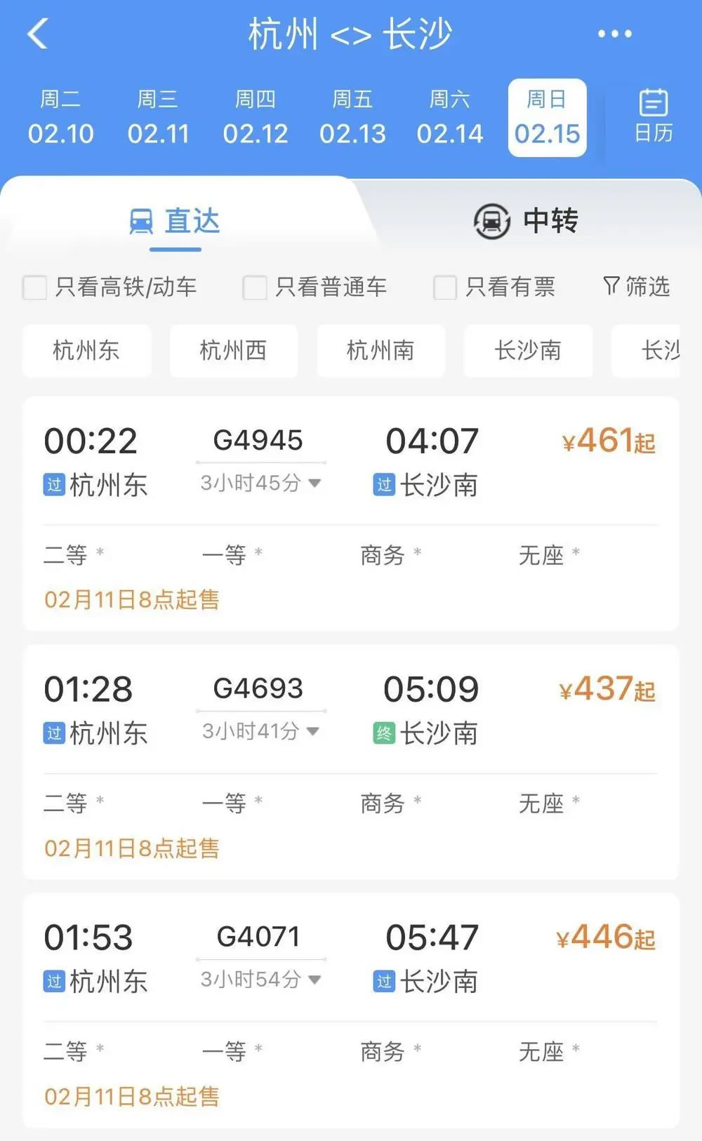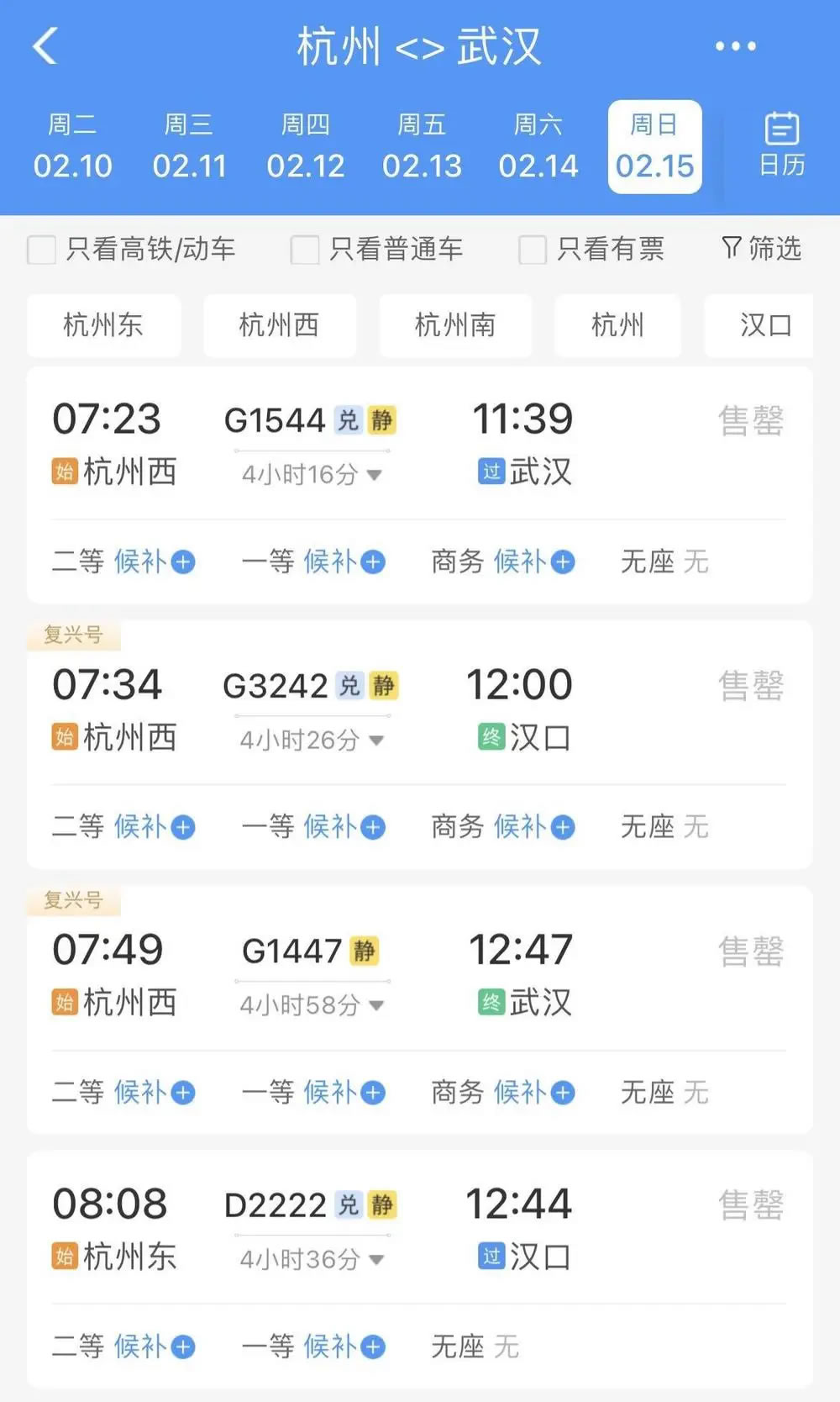 比如,2月15日杭州前往武漢、長(zhǎng)沙、南昌、貴陽(yáng)等地,無(wú)論是普速列車(chē)還是動(dòng)車(chē)組列車(chē),當(dāng)天所有車(chē)次已經(jīng)基本全部售罄,只剩極個(gè)別車(chē)次硬座、無(wú)座席位還有余票。