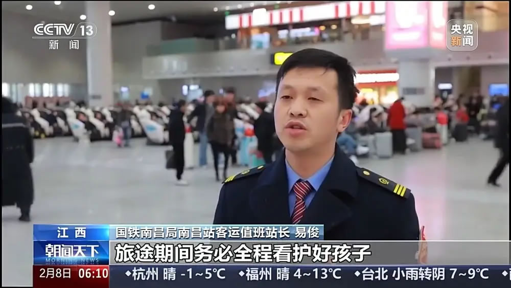 國鐵南昌局南昌站客運(yùn)值班站長 易。郝猛酒陂g務(wù)必全程看護(hù)好孩子,切勿讓孩子脫離視線。如需幫助,可聯(lián)系車站工作人員和民警,謹(jǐn)防孩子走失、接觸陌生人員。
