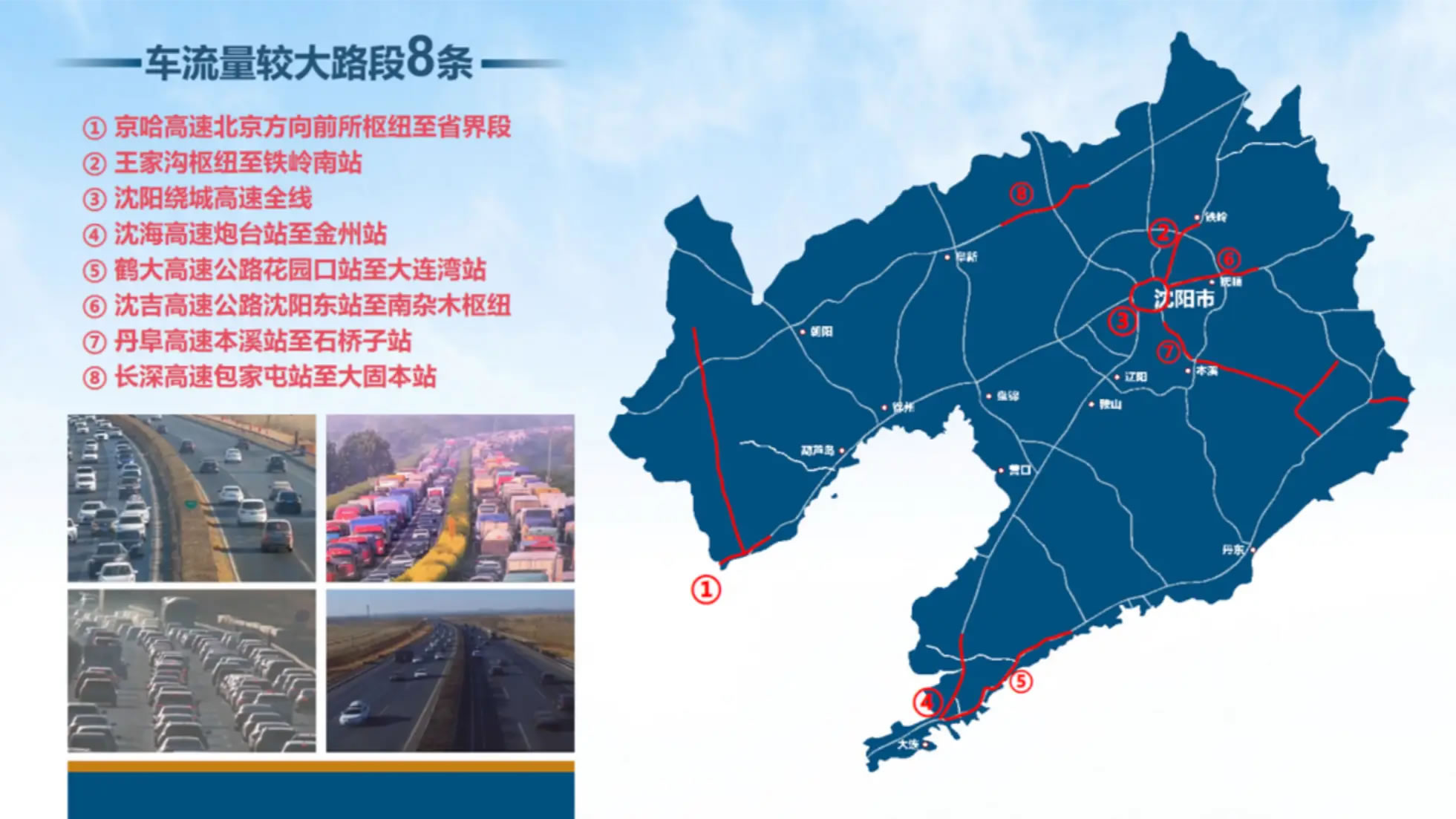 2月14日,記者從遼寧交投高速運(yùn)營公司了解到,據(jù)預(yù)測,春節(jié)9天,全省高速公路車流量將達(dá)到962.6萬臺次,日均106.9萬臺次,同比增長36.5%。其中,沈陽、桃仙等15個收費(fèi)站;京哈高速沈山段全線、沈陽繞城高速全線等8條路段;京哈高速遼中、凌海、盤錦服務(wù)區(qū),長深高速那四服務(wù)區(qū)等10個服務(wù)區(qū)車流量較大。