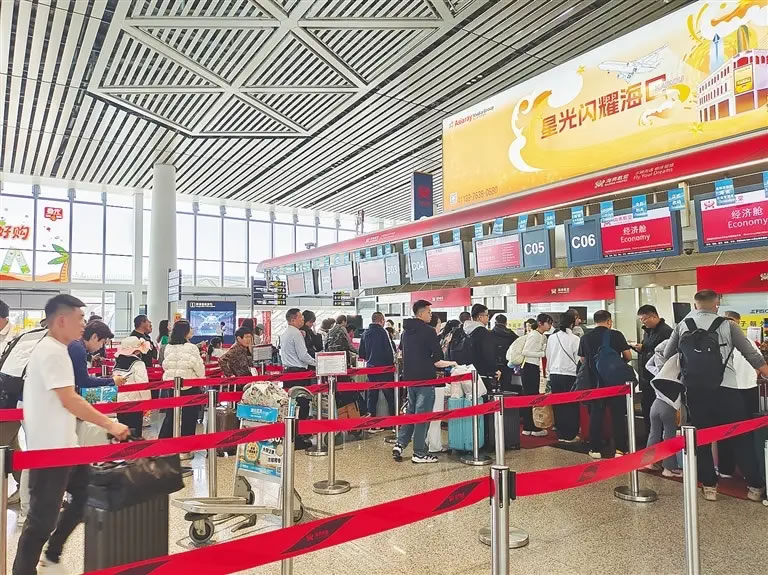 旅客在?诿捞m國(guó)際機(jī)場(chǎng)辦理乘機(jī)手續(xù)。海南日?qǐng)?bào)全媒體記者 鄧海寧 攝