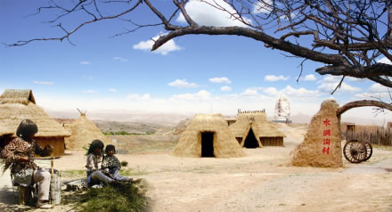 古老的水洞溝村是由北方的先民們創(chuàng)造了窖洞式和地穴式的居室方式。這種居室往往是建在黃土層較厚的山坡或溝岸上,具有冬暖夏涼的特點(diǎn)。水洞溝人在此基礎(chǔ)上改進(jìn)了這種居住方式,發(fā)展成一種半地穴式建筑形式。其方法是在黃土坡上先挖出一定深度的地穴,然后在地穴四壁確定為墻壁的地基上,用土坯(pī)壘墻,使之達(dá)到一定高度,再以桁(xíng)條,木椽搭頂,復(fù)以柴草,柴草上面糊以泥土,防止漏水。水洞溝村就是這樣一個古老的半地穴式的聚集村落遺址,我國西北地區(qū)群眾習(xí)稱其為“地窩子”。水洞溝村聚落共有29處地穴式建筑遺址,我們選擇了其中的一些進(jìn)行了恢復(fù),讓我們能夠直觀地了解先民們的居住形式。