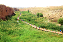 水洞溝長城觀景臺,是覽水洞溝大峽谷和蘆花谷美景的最佳觀賞地。站在觀景臺上,溝壑縱橫,地形獨(dú)特的土林景觀仿佛就在腳下,跌宕逶迤直達(dá)峽谷深處。整片翠綠的蘆葦蕩隨風(fēng)擺蕩,風(fēng)景蔚為壯觀;時而野鴿飛翔,紅嘴鴨叫聲四起,泉水潺潺發(fā)出聲響,匯集成溪。