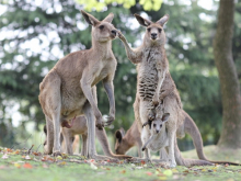 袋鼠是澳大利亞的國獸,有著獨特的育兒方式,袋鼠習(xí)慣用后肢跳躍前進,時速可達60公里。袋鼠坡草坪上的灰大袋鼠、赤大袋鼠組群生活,它們性格溫順。