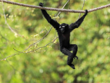 展區(qū)內(nèi)樹木成蔭,還安置了許多豐容設(shè)施。長臂猿最愛在高大樹木、纜繩間嬉戲。