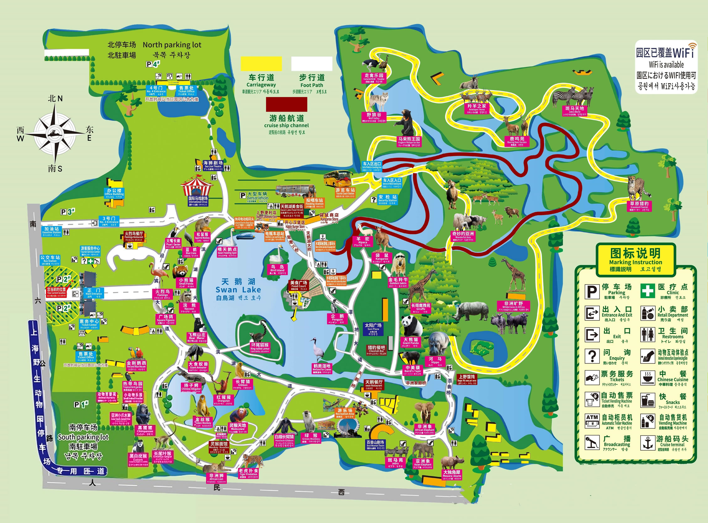上海野生動物園現(xiàn)有車入?yún)^(qū)、步行區(qū)兩大區(qū)域。車入?yún)^(qū)分布著奇妙的亞洲、非洲曠野、優(yōu)雅長頸鹿、最美閃電俠、草原霸主、荒野大力熊、森林之王、白虎領(lǐng)地、野狼谷、馬來熊王國10大主題區(qū)域。步行區(qū)則分布著大熊貓館、鶴類濕地、火烈鳥展區(qū)、企鵝館、天鵝湖、羊駝苑、紅猩猩館、中美貘館、小動物樂園、鸚鵡館、河馬館、白眉長臂猿展區(qū)、大食蟻獸展區(qū)、鱷魚島、狐猴島、浣熊展區(qū)、金絲猴島、飛熊山莊、綠猴區(qū)、白虎展區(qū)、松鼠猴、小熊貓區(qū)、黑猩猩館、袋鼠坡、長頸鹿雅苑、亞洲象展區(qū)、金毛羚牛館、國禮非洲獅展區(qū)、熱帶鳥園、斑馬苑、非洲象展區(qū)、老虎撲食區(qū)、白頰長臂猿島、藍鶴、大獨角犀、大嘴長廊、靈猴天地、亞洲小爪水獺展區(qū)、太陽廣場共39個館區(qū)。