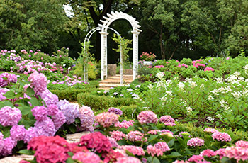 位于綠蔭茶室東側(cè),占地6000余平米,集觀花、休閑于一身,設(shè)有品種展示區(qū)、觀景平臺、休閑平臺、木棧道等;▓@中心區(qū)域種植了30個品種近500余盆色彩繽紛的八仙花,如“無盡夏”、“夢幻藍(lán)”、“紅粉佳人”等,結(jié)合白色的歐式拱門和落地盆景等,展現(xiàn)出浪漫的歐式風(fēng)情。而主入口處古樸的木亭、蜿蜒的旱溪和木質(zhì)棧臺等造景,又凸顯八仙花恬靜典雅之美。游客步入園中移步異景,從不同角度都能欣賞八仙花的風(fēng)姿卓絕。