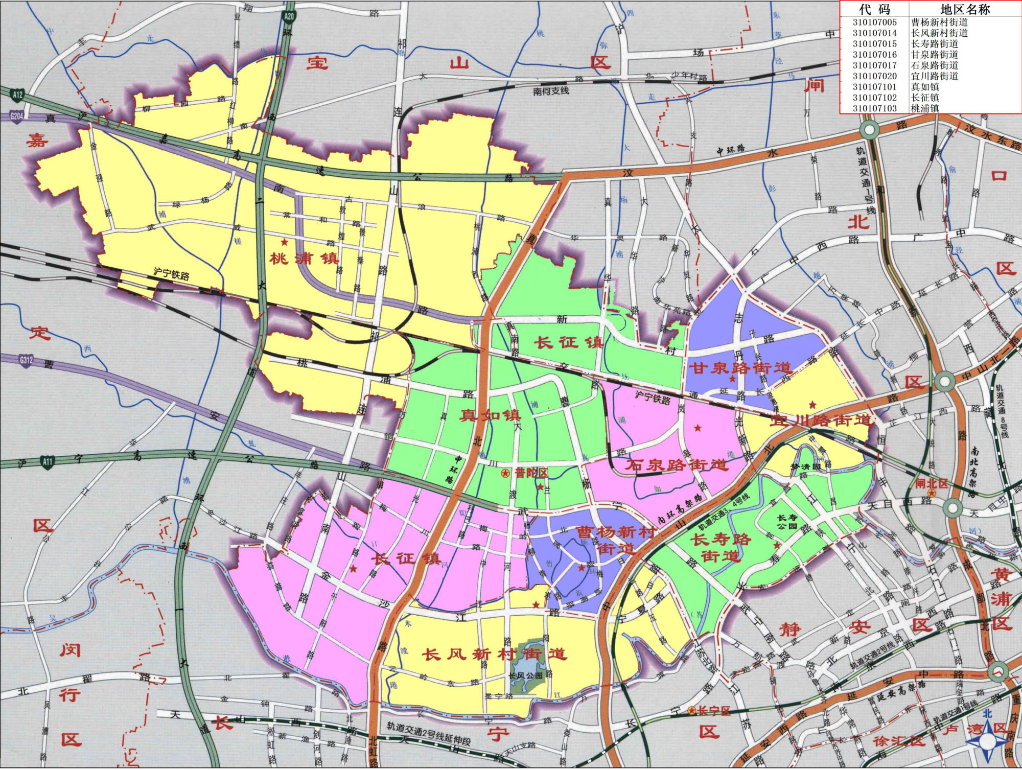 街道:曹楊新村街道、長(zhǎng)風(fēng)新村街道、長(zhǎng)壽路街道、甘泉路街道、石泉路街道、宜川路街道、萬(wàn)里街道、真如鎮(zhèn)街道