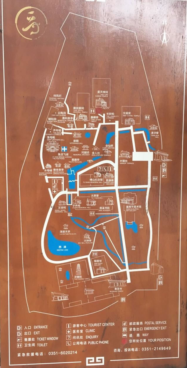 北部從文昌宮起,有東岳祠、關(guān)帝廟、三清祠、唐叔祠、朝陽(yáng)洞、待風(fēng)軒、三臺(tái)閣、讀書臺(tái)和呂祖閣。這一組建筑物大部隨地勢(shì)自然錯(cuò)綜排列,以崇摟高閣取勝。南部從勝瀛樓起,有白鶴亭、三圣祠、真趣亭、難老泉亭、水母樓和公輸子祠。這一組樓臺(tái)計(jì)峙,泉流潺繞,頗具江南園林風(fēng)韻。