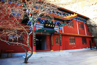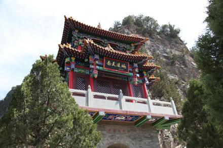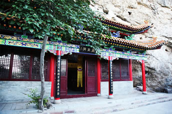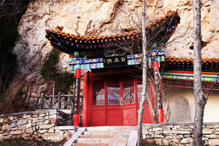 龍王洞在天竺寺景區(qū),位于石膏山上巖溶洞之東側(cè),洞高5米,寬8米,深10米許,洞內(nèi)建龍王祠。龍王祠面闊一間。洞前辟有四級平臺,紅條石漫地,松柏間植,環(huán)境幽雅。洞東通一小洞,深不可測,洞口壁上有赭紅字跡“龍水宮”;洞內(nèi)泉水汩汩而出,清澈異常。洞外崖壁石縫間平生一株山桃,主桿直徑不過10厘米,貼地生出百十根分枝,呈扇面狀!吧让妗庇3米多長、2米多寬。每逢陽春三月,滿樹桃花盛開,有如鳳凰展翅。這就是石膏山古景之一的“龍鳳呈祥”。 |