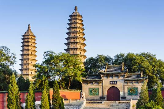 永祚寺雙塔,雄偉異常,雙雙聳立如筆,故有“文筆雙塔”之譽,更被譽為太原的標(biāo)志。雙塔并非同時建成,東南塔稍早,西北塔較晚。兩塔相距60米,取“真言密教以十六數(shù)表圓滿無盡”之意。二塔均為全磚石結(jié)構(gòu),只在各層角檐內(nèi)裝有一根挑木,構(gòu)建技巧十分精湛。
