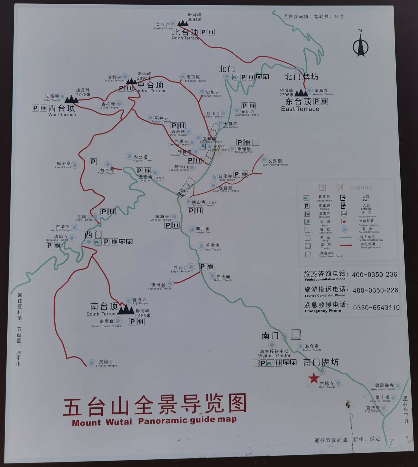 北臺名葉斗峰,海拔3061米,五臺最高,有“華北屋脊”之稱,其臺“頂平廣,圓周四里,其下仰視,巔摩斗杓,故以為名!笨滴趸实圪x詩贊曰:“絕磴摩群峭,高寒逼斗宮。鐘鳴千嶂外,人語九霄中。朔雪晴猶積,春冰暖未融。憑虛看陸海,此地即方蓬。”