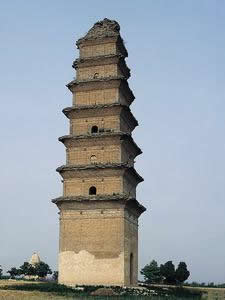 羅山寺塔位于和家莊鄉(xiāng)東馬村村南乳羅山東峰上,也是唐代所建。塔東西兩側(cè)各有清代進(jìn)士仵魁所筑土塔一座,遠(yuǎn)望狀如筆架,故又名“文峰”。塔南山坡下是孟莊鄉(xiāng)岱堡村,因之群眾俗稱“岱堡塔”。羅山寺已不存,今僅留塔。塔為樓閣式空心方形,原為九級(jí),頂已毀,現(xiàn)存八級(jí),殘高約30米。面闊與進(jìn)深均為三間,券門(mén)南向。塔內(nèi)原架木質(zhì)樓板,沿梯可登塔頂,今已不存。塔體呈紡錘形,無(wú)基座,各級(jí)券洞有假門(mén)。高大莊嚴(yán),為合陽(yáng)諸塔之冠,亦屬陜西省重點(diǎn)文物保護(hù)單位。明末清初關(guān)中八高士之一的李灌(向若)先生曾在塔下筑穴而居,稱“小桃源”;清代合陽(yáng)女詩(shī)人雷敬(史夫人)尋夫到此,曾用銀簪在羅山寺門(mén)前的照壁刻下“寺野鐘聲遠(yuǎn),山荒風(fēng)雨多”的詩(shī)名。大像寺位于平政鄉(xiāng)安陽(yáng)村東北。大像寺又名“大云禪院”,毀于抗日戰(zhàn)爭(zhēng)時(shí)期,獨(dú)留此塔。塔系宋代所建,為疊澀密檐式方磚塔,第一屋有券洞,內(nèi)為神龕,十三層,高約30米,下有長(zhǎng)寬各4.8米的方形基座。第一層塔檐下普柏枋上設(shè)有斗拱,仿木結(jié)構(gòu),懸空出挑,有實(shí)用價(jià)值,為本縣諸塔中所僅見(jiàn)。塔項(xiàng)已偏離中心5度,是名副其實(shí)的“斜塔”。大像寺又是一座奇妙的回音塔,站在塔北的土胡洞中用瓦片敲擊,便可聽(tīng)到清脆的蛤蟆叫聲,其余三面均無(wú)此現(xiàn)象。