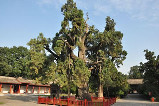 黃帝腳印石旁,有一棵漢武掛甲柏,又稱將軍柏,志載:“漢武帝征朔方還,掛甲于此樹!睒涓砂吆勖懿,縱橫成行,似有斷釘在內(nèi),是群柏之中最為奇特的一株。特別是每年清明節(jié)前,這棵古柏枝干上流出的柏液凝結(jié)為球狀,經(jīng)陽光反射尤為壯觀,吸引著各地前來謁陵拜祖的人。然而清明節(jié)一過,柏液中斷,古柏從枝到桿又恢復(fù)了原來密密麻麻的甲痕。