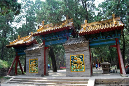 神道盡頭便是陵區(qū)。陵園四周順依山勢,修有綿亙不絕的青磚圍墻,高1.6米,涂以紅色,象征至尊至偉。墻頭為紅椽綠瓦,古色古香。整個(gè)陵園,南北約210米,東西約72米。