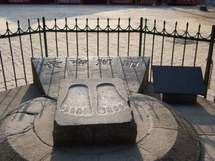 整塊石頭約一平方米。青石面上,鐫刻有黃帝腳印一雙。民間有向黃帝腳印投硬幣或零錢以測運(yùn)氣的習(xí)俗,據(jù)說投向腳印大拇趾運(yùn)氣最好,為大吉大利。