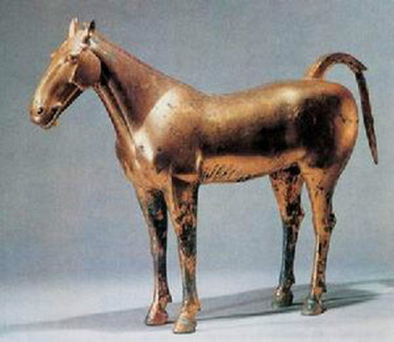 1981年5月在平陽公主墓南,西吳鄉(xiāng)竇馬村農民在平整土地時發(fā)現(xiàn)這件文物。高62厘米,長76厘米,通體銅鑄鎏金,昂首,翹尾,四腿直立,體態(tài)矯健。頭部造型甚為生動,粉鼻亮眼,兩耳豎立。史書記載其為“金馬”,系以西漢時大宛國的汗血馬為原型而精制的工藝品。這件國寶,現(xiàn)收藏在茂陵博物館。