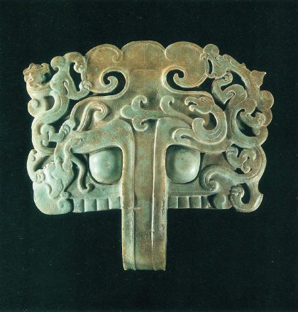 橫寬36.5厘米,灰綠色,下有凸鈕,四角略弧圓,分別碾琢其時流行的青龍、白虎、朱雀、玄武四神像。器物下方以環(huán)鈕為鼻梁,上連粗眉和暴起雙眼,形成大獸面,下緣則以8條豎紋勾勒出寬大的排牙。圖案化的形象莊嚴凝重,工藝精美,線條運用剛柔相濟。