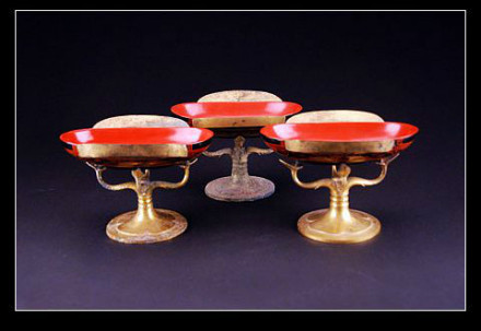 1981年5月茂陵一號無名冢南出土,整體分為座、杯上下兩部分,座為盤足,柿蒂狀支架,承托耳杯。酒杯平面呈橢圓形,圓形底,兩側附耳,紋飾華美,漆工與鎏金皆精湛,是研究西漢工藝美術史的珍貴實物資料。