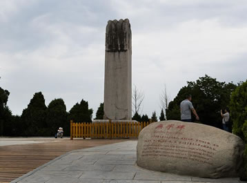 在朱雀門外的司馬道東側(cè),聳立著聞名于世的無(wú)字碑,通身取材于一塊完整的巨石,高7.53米,寬2.1米,厚1.49米,總重量98.8噸,給人以凝重厚實(shí),渾然一體的美感。碑額未題碑名,碑額陽(yáng)面正中一條螭龍,左右側(cè)各四條,共有九條螭龍,故亦稱“九龍碑”。碑的兩側(cè)有升龍圖,各有一條線刻而成騰空飛舞的巨龍,栩栩如生。碑座陽(yáng)面還有線刻的獅馬圖(或稱獅馬相斗圖),長(zhǎng)2.14米,寬0.66米。其馬屈蹄俯首,雄獅則昂首怒目。碑上還有許多花草紋飾,線條精細(xì)流暢。