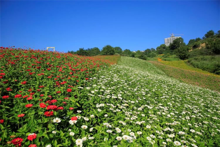 沿著小路拾級而上,百花爛漫,林木蔥郁,紅色的百日草、粉色的格;、紫色的薰衣草、嬌艷欲滴的虞美人、絢麗多姿的醉蝶......從山谷中傾瀉而下,如同一條彩色的小溪,置身其中,好似沉浸于花香鳥語的蝴蝶一般翩翩起舞、流連忘返。