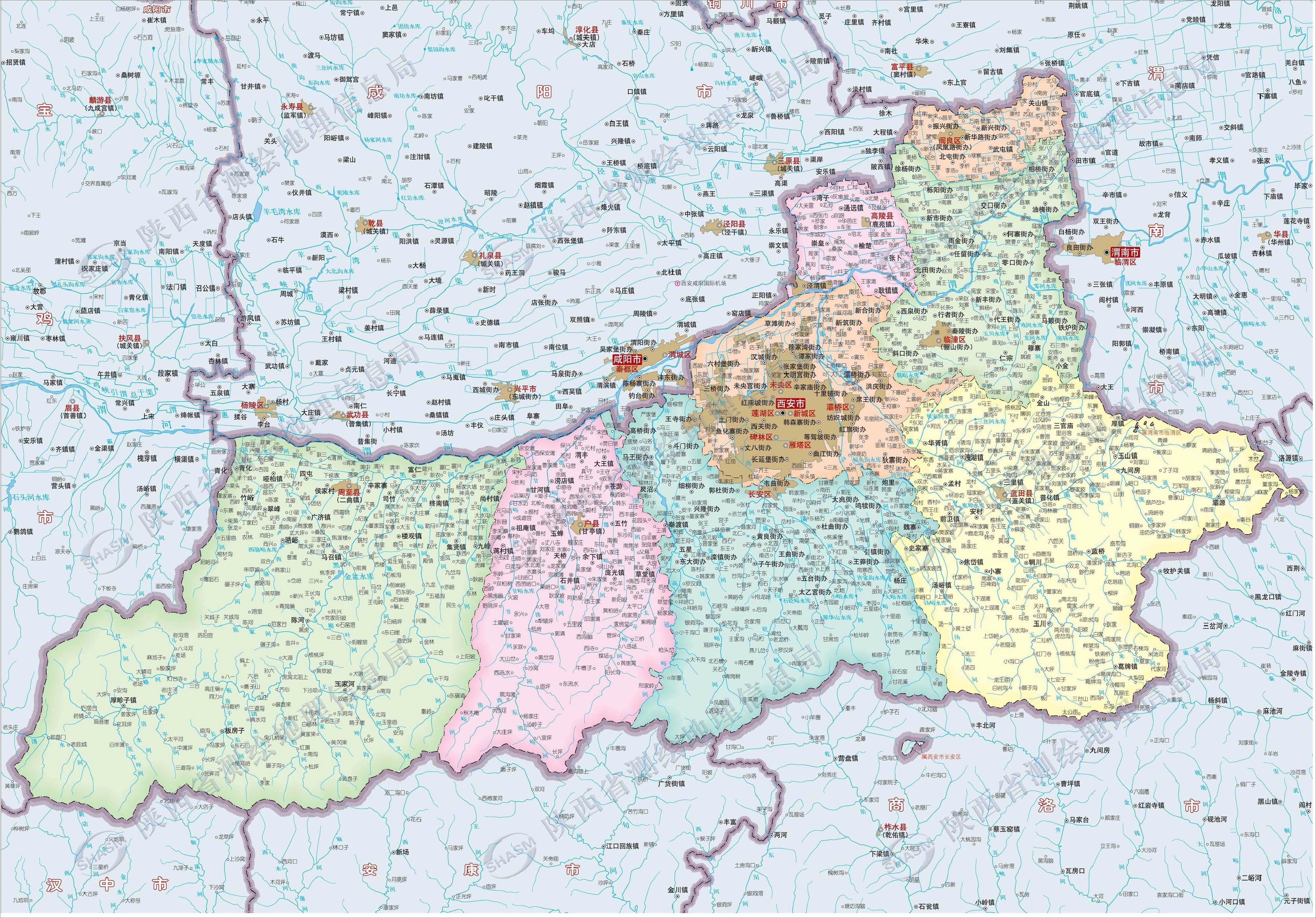 西安市位于黃河流域中部關(guān)中盆地,北臨渭河和黃土高原,南鄰秦嶺。東以零河和灞源山地為界,與渭南市華州區(qū)、商洛市商州區(qū)、洛南縣相接;西以太白山地及青化黃土臺(tái)塬為界,與眉縣、太白縣接壤;南至北秦嶺主脊,與佛坪縣、寧陜縣、柞水縣分界;北至渭河,東北跨渭河,與咸陽(yáng)市區(qū)、楊凌區(qū)和三原、涇陽(yáng)、興平、武功、扶風(fēng)、富平等縣(市)相鄰。轄境東西長(zhǎng)約204千米,南北寬約116千米,總面積10108平方千米。